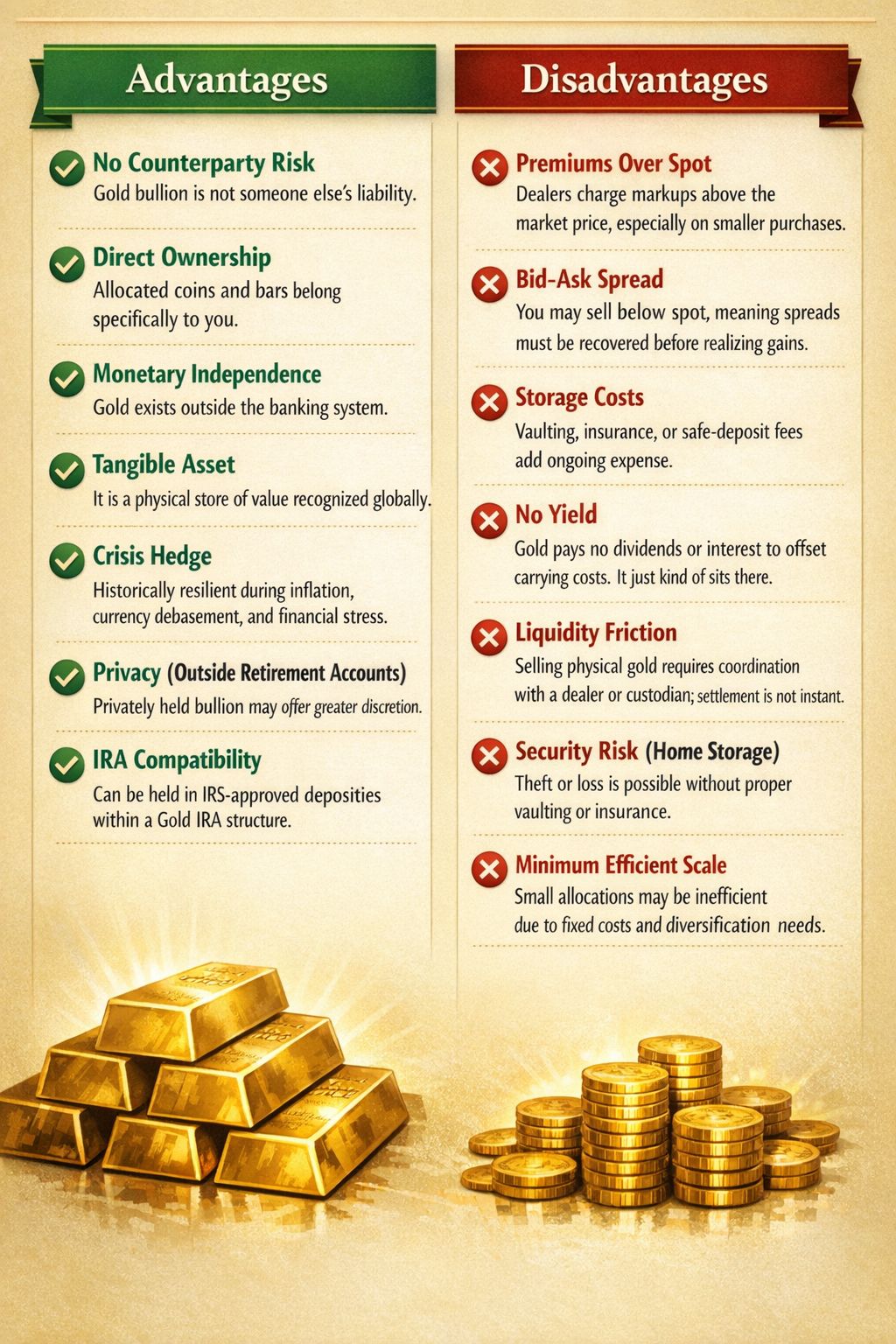 For investors allocating meaningful capital, physical bullion offers several structural advantages.